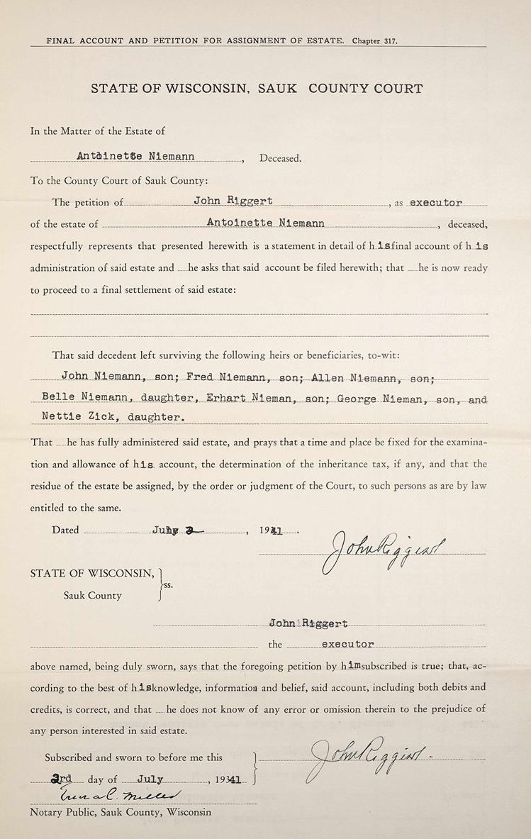 Probate petition of estate of Antoinette Niemann by executor John Riggert 02 Jul 1941, Sauk county, Wisconsin