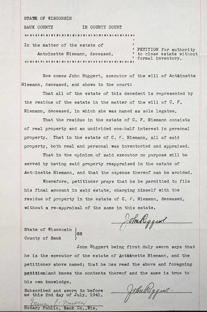 Probate petition transcript of Antoinette Niemann by executor John Riggert 02 Jul 1941, Sauk county, Wisconsin