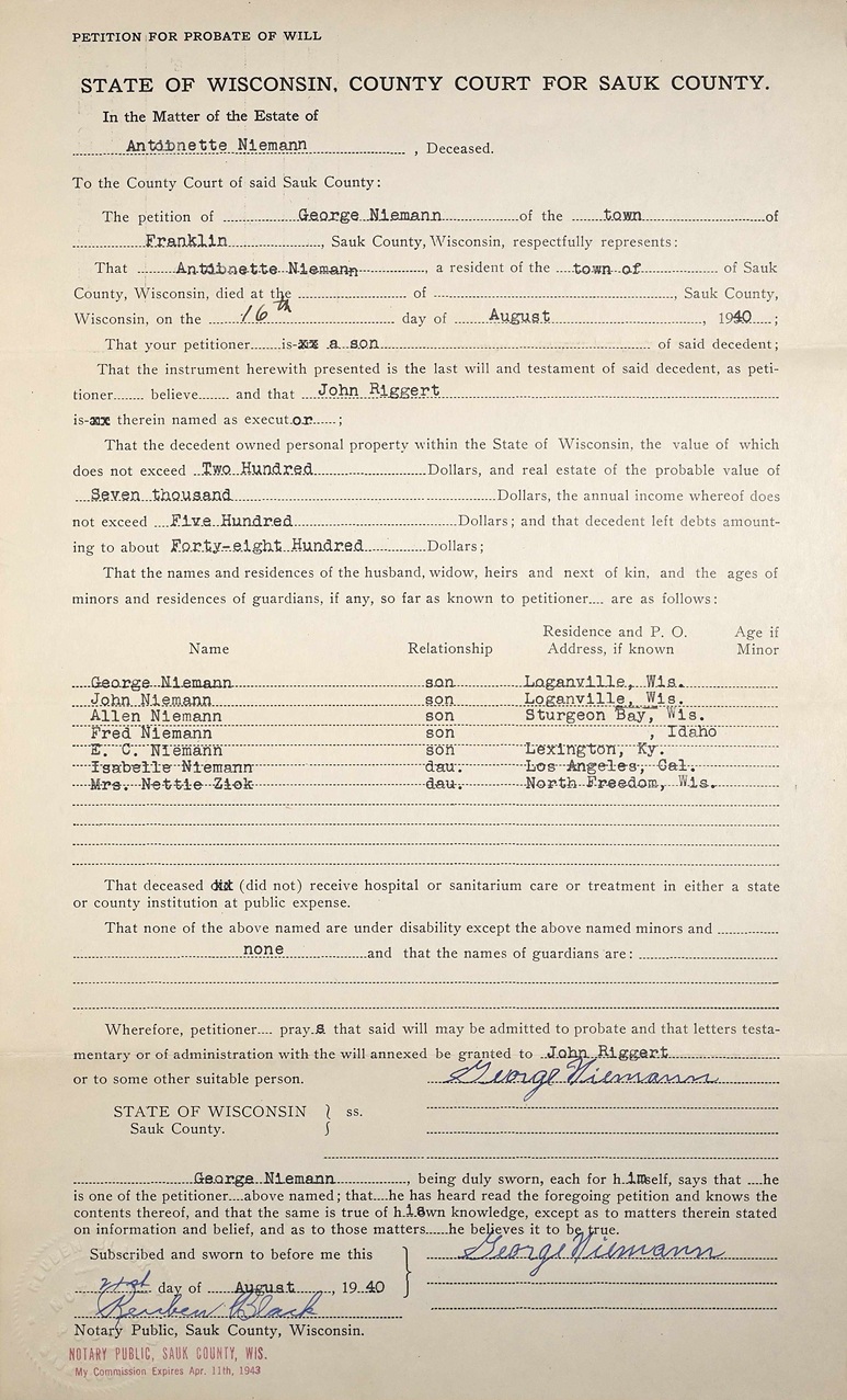 Petition for probate of will of Antoinette Niemann by George Niemann 16 Aug 1940 Sauk county, Wisconsin