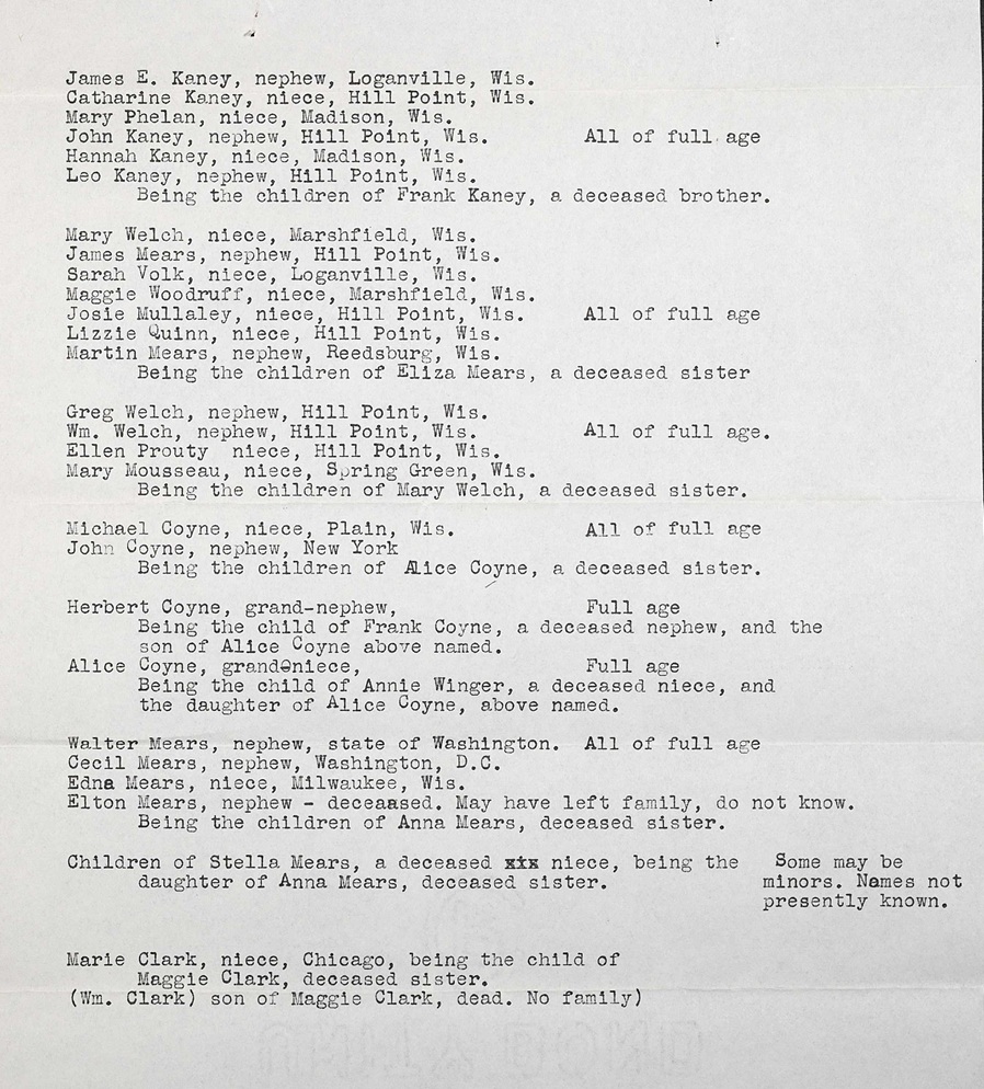 Probate estate case record heirs of James E Kaney, unmarried, died Apr 1937 Sauk county, Wisconsin