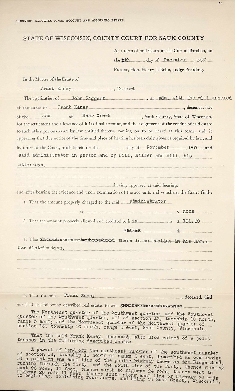 Probate final account of estate of Frank Kaney - page 1 - 08 Dec 1937 Sauk county, Wisconsin.jpg