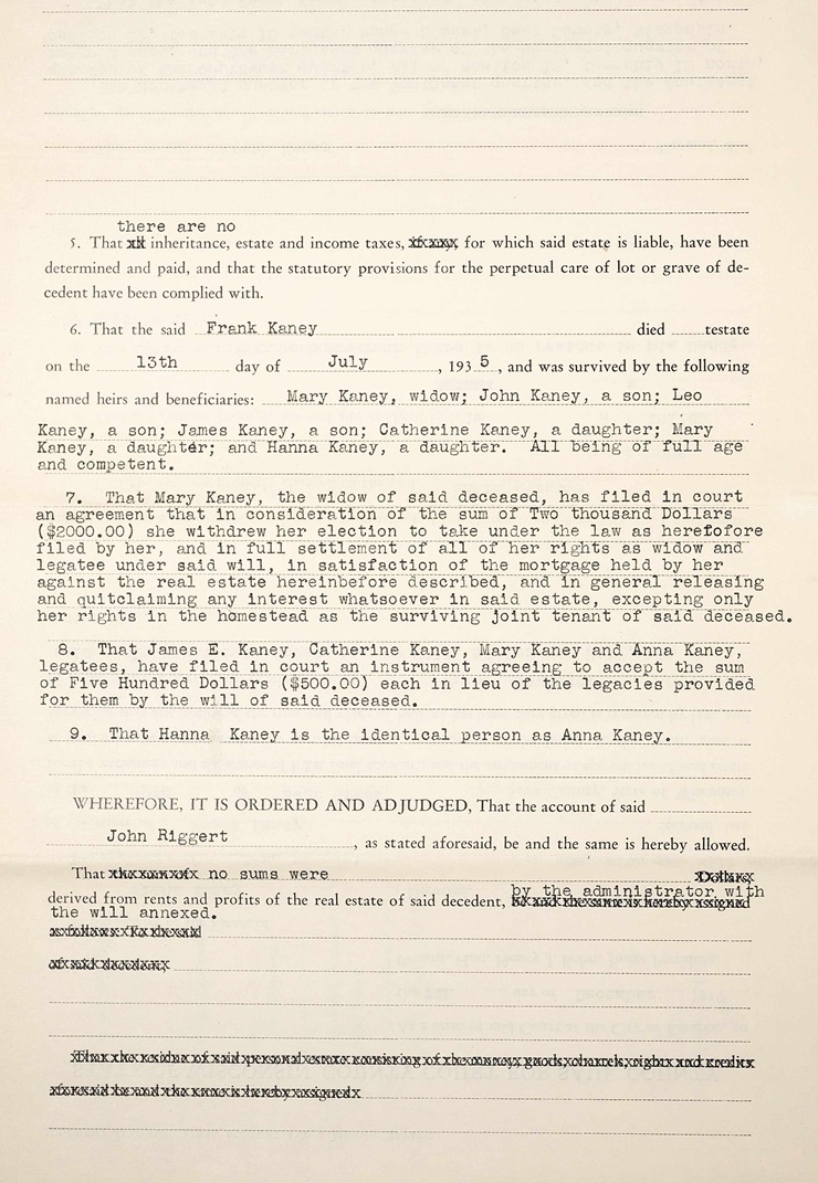 Probate final account of estate of Frank Kaney - page 2 - 08 Dec 1937 Sauk county, Wisconsin.jpg