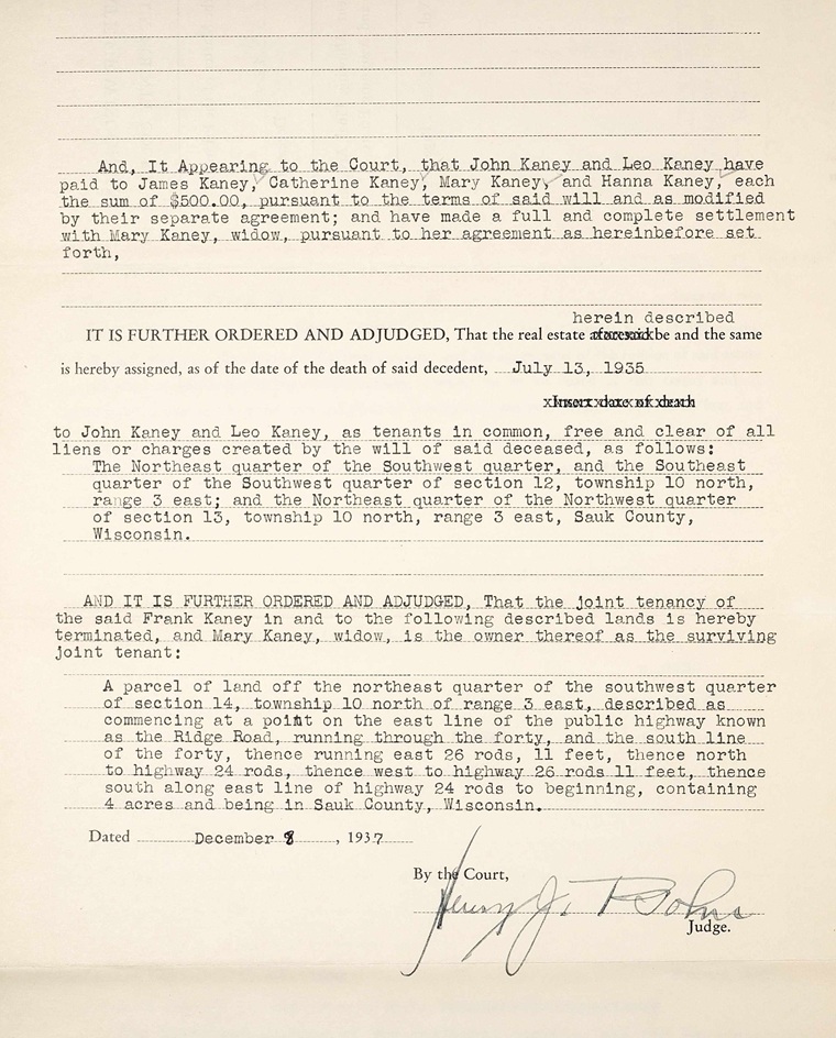 Probate final account of estate of Frank Kaney - page 3 - 08 Dec 1937 Sauk county, Wisconsin.jpg