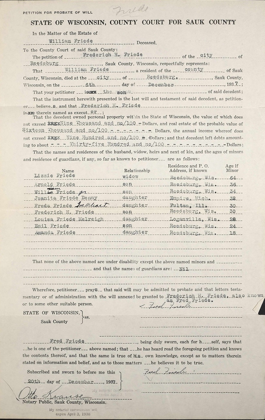 Petition for probate of will of William Friede 20 Dec 1937 Sauk county, Wisconsin