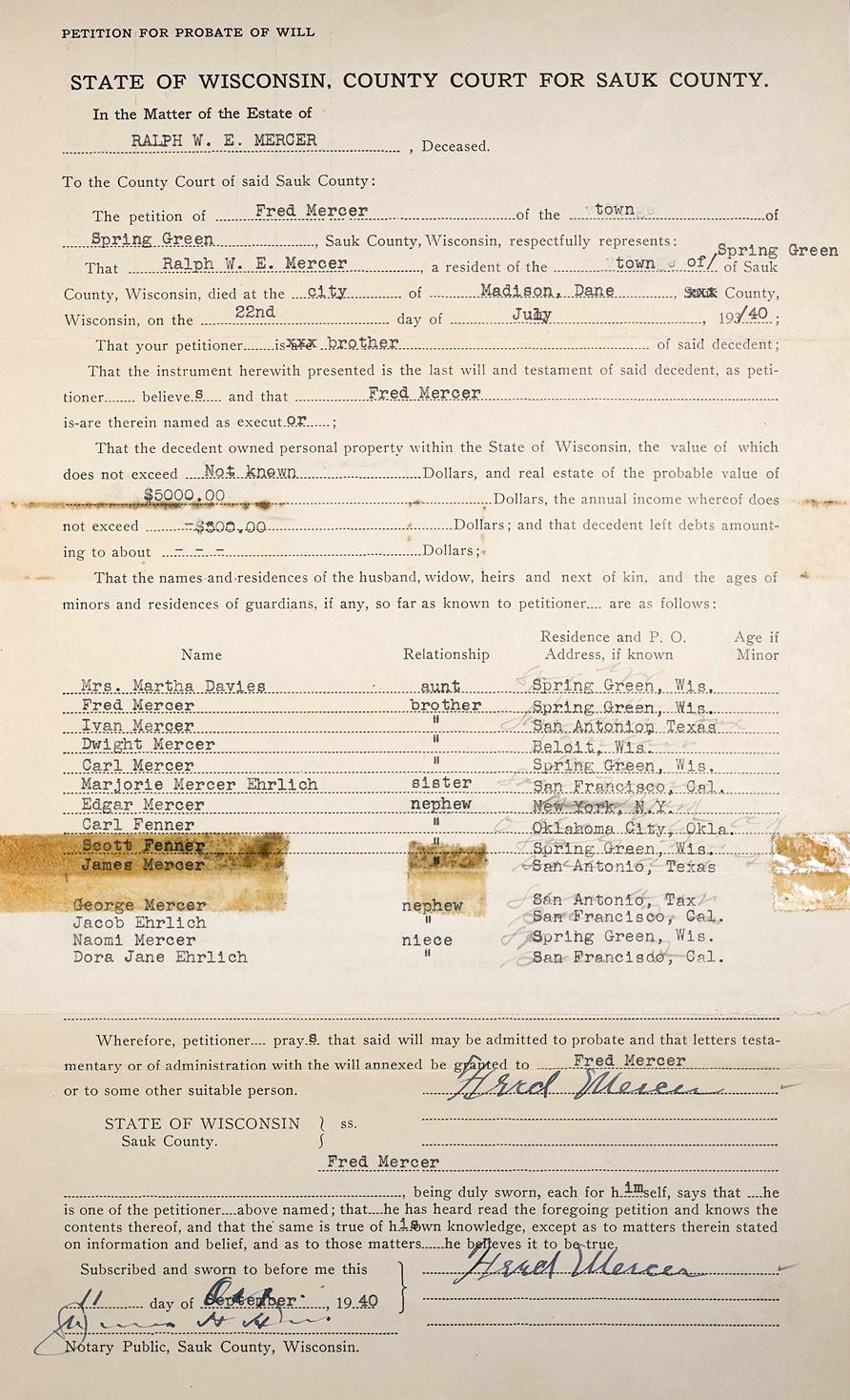 Probate petition for estate of Ralph W E Mercer 11 Oct 1940 Sauk county, Wisconsin