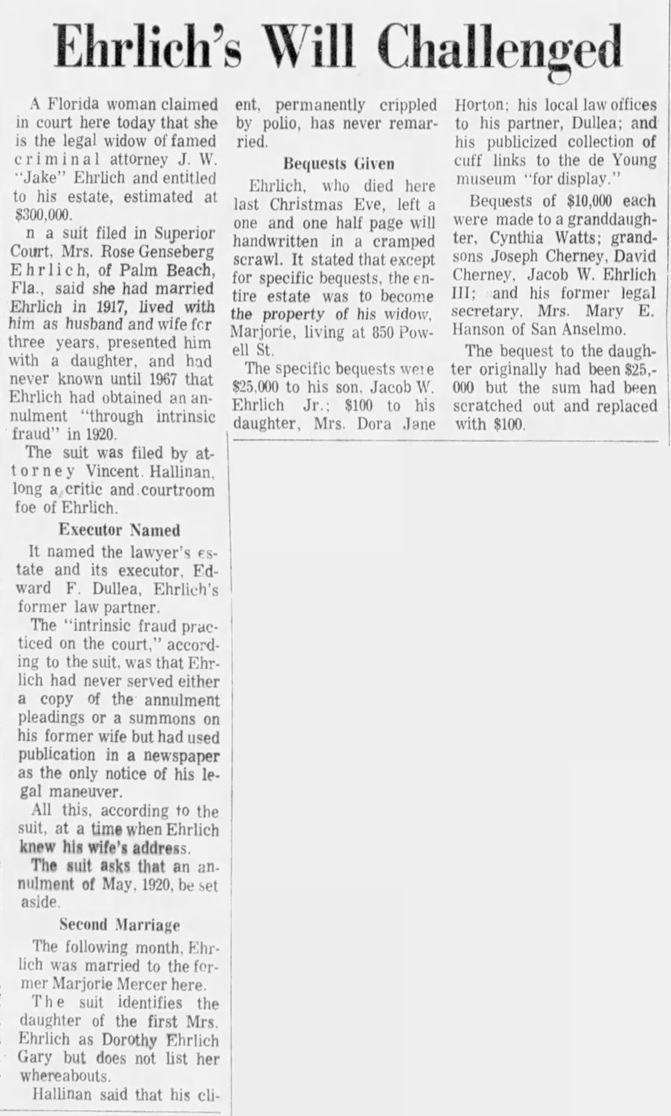 The San Francisco Examiner (San Francisco, California) 07 Apr 1972 - J W (Jake) Ehrlich handwritten will challenged