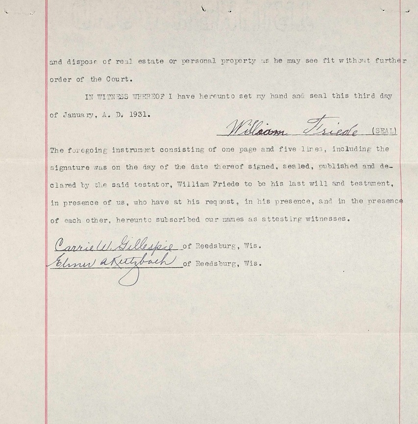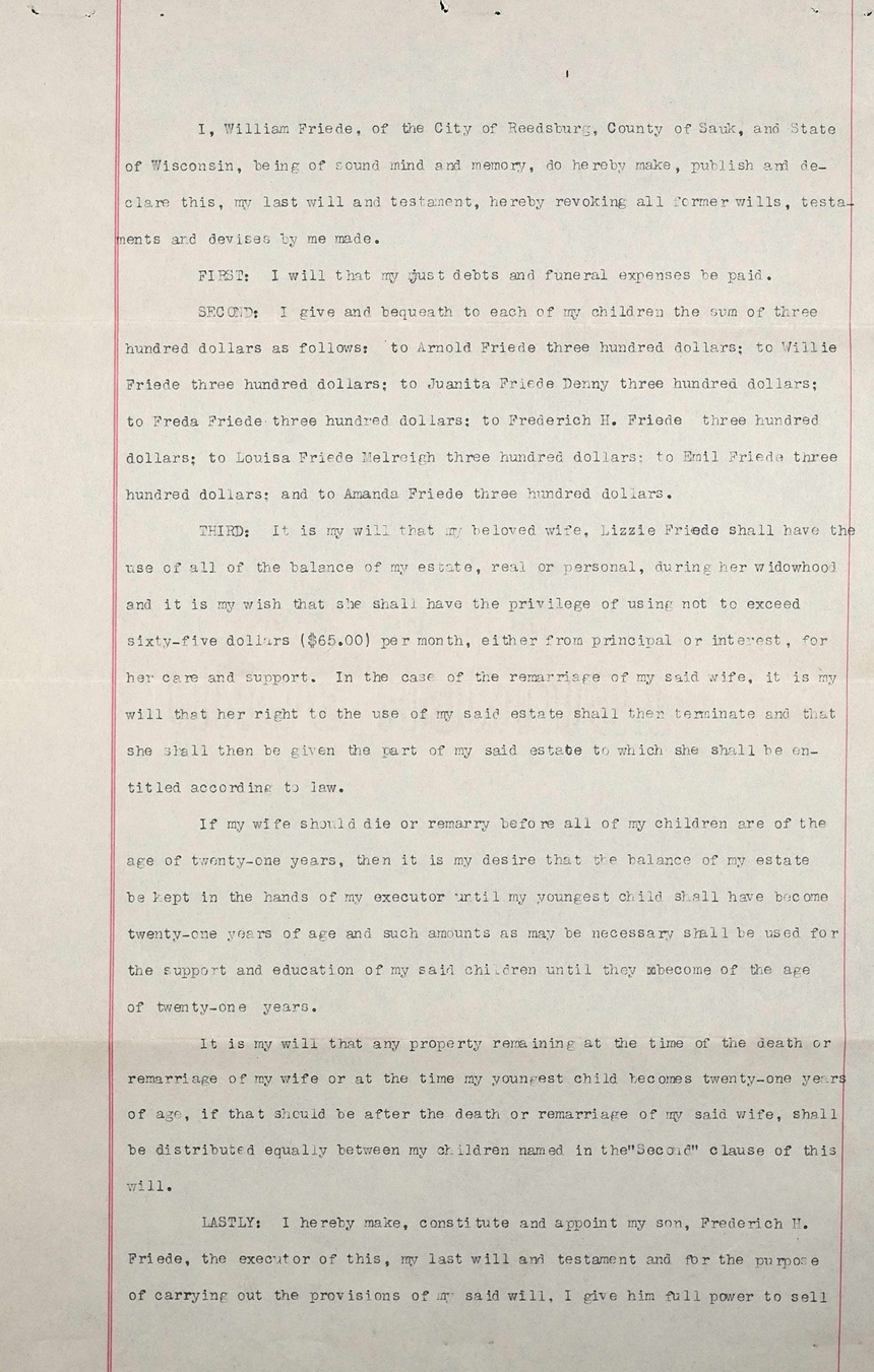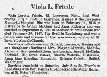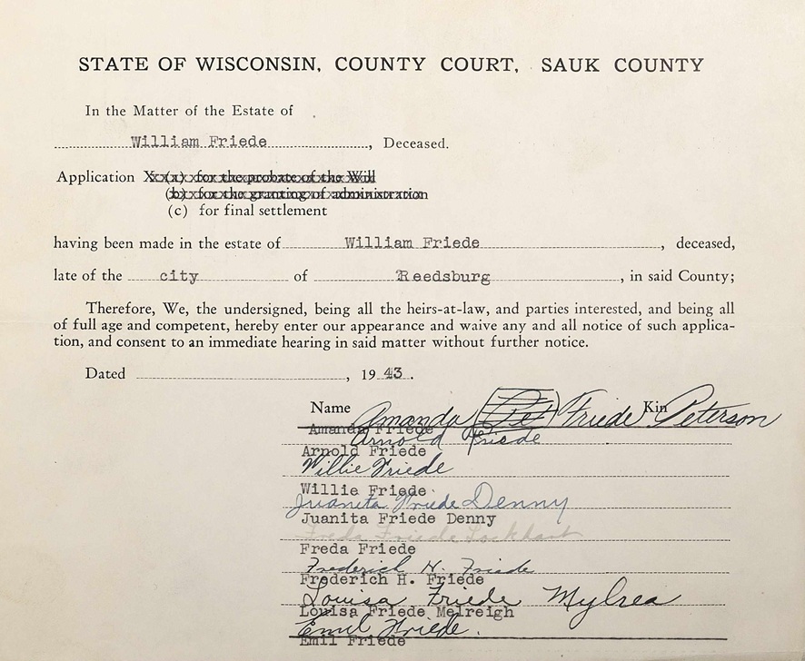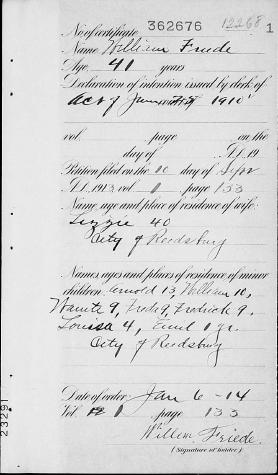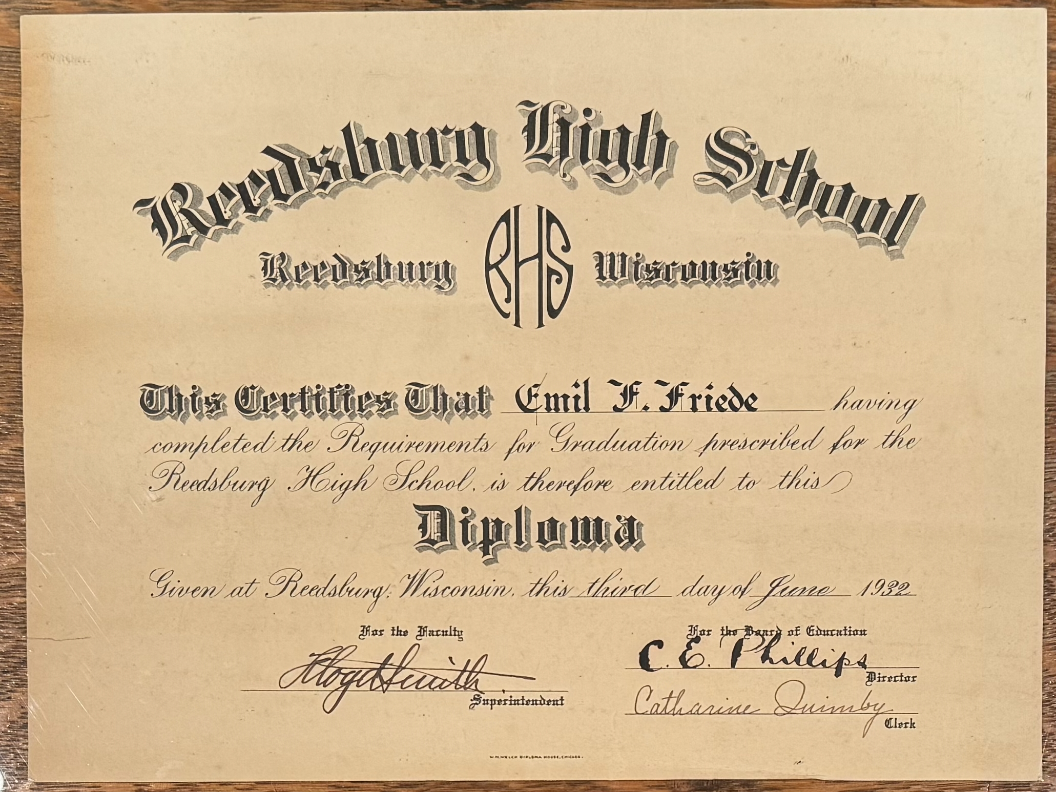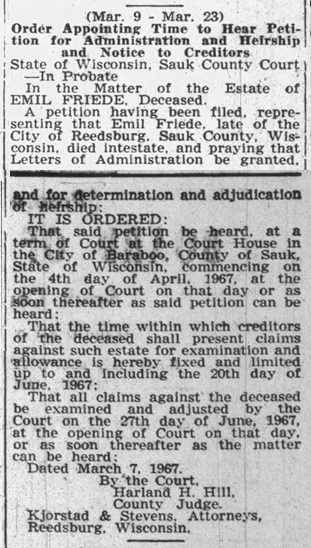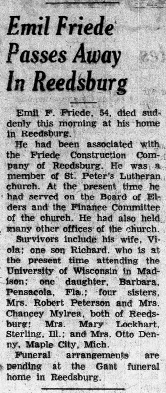 - [S387] Family Search; Multiple Records, "Wisconsin Death Index, 1959-1997," database, FamilySearch (https://familysearch.org/ark:/61903/1:1:V892-699 : 12 December 2014), Emil F Friede, 25 Feb 1967; from "Wisconsin Death Index, 1959-1997," database and images, Ancestry (http://www.ancestry.com : 2007); citing certificate number 005949, Reed, , Wisconsin, Wisconsin Department of Health, Madison.