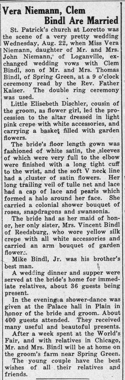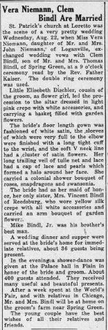 Child of Clemance Joseph Bindl and Vera Lorraine Niemann