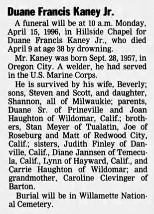 Father* | Duane Francis Kaney Sr. b. 15 Jul 1929, d. 2 Apr 2003 |