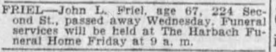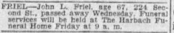 - John Lawrence Friel b. 26 Nov 1868, d. 21 Aug 1935