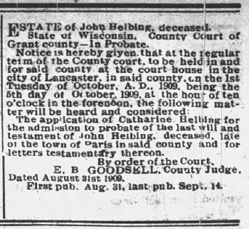 - [S387] Family Search; Multiple Records, "Wisconsin, County Marriages, 1836-1911," database, FamilySearch (https://familysearch.org/ark:/61903/1:1:XRJ6-12Z : 3 June 2016), John Helbing in entry for Peter Miller and Caroline Helbing, 09 Jun 1903; citing , Grant, Wisconsin, United States, Wisconsin Historical Society, Madison; FHL microfilm 1,266,664.