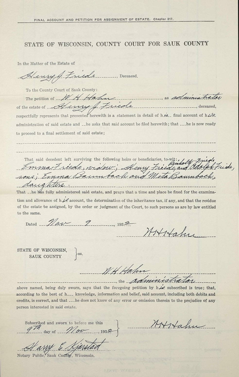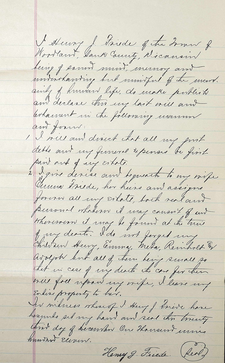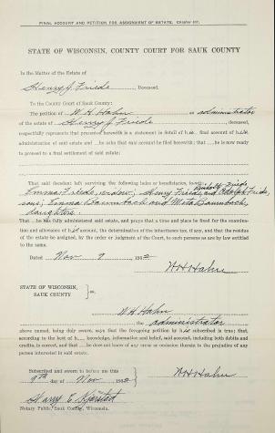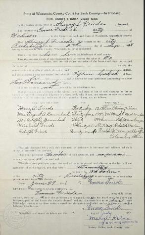- [S387] Family Search; Multiple Records, "Wisconsin Marriages, 1836-1930," database, FamilySearch (https://familysearch.org/ark:/61903/1:1:XRRY-GLZ : 4 December 2014), John H.W. Friede and Emma E. Goldmund, 29 Sep 1893; citing reference ; FHL microfilm 1,275,560.