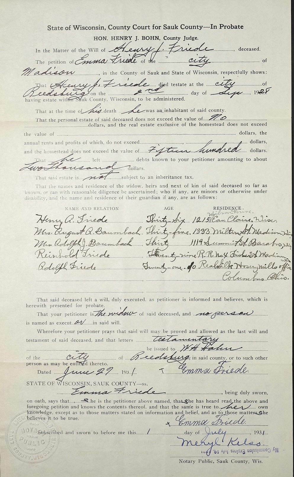Children of Henry Albert Friede and Hulda Meyer