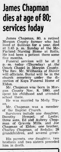 - [S244] U.S. Federal Census 1910 U.S. Federal Census, by Ancestry.com, Year: 1910; Census Place: Franklin, Miller, Missouri; Roll: T624_799; Page: 11B; Enumeration District: 0081; FHL microfilm: 1374812.
