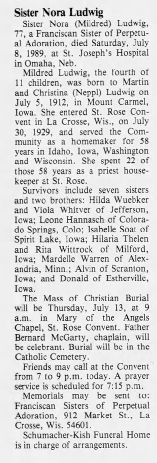 - Mildred Ludwig b. 5 Jul 1912, d. 8 Jul 1989
