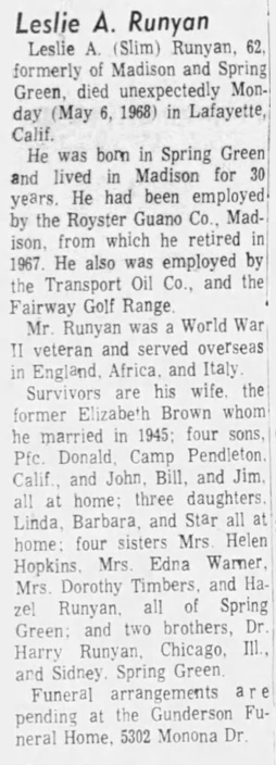 - Leslie Arthur Runyan+ b. 11 Jul 1905, d. 6 May 1968