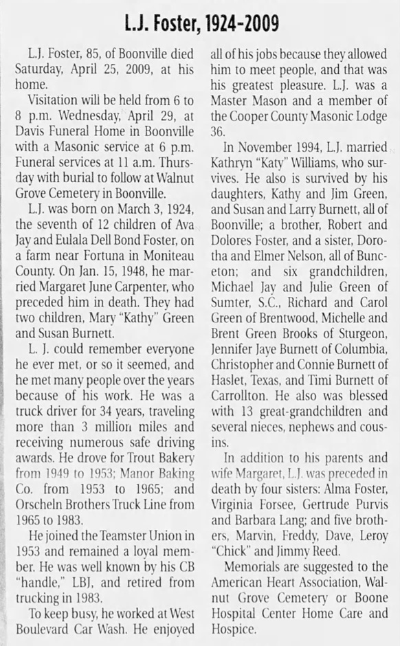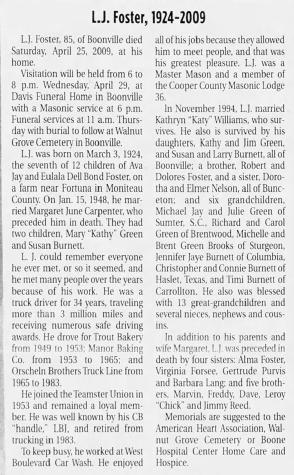 - L. J. Foster+ b. 3 Mar 1924, d. 25 Apr 2009