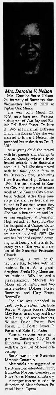 - Dorotha Verna Foster b. 23 Mar 1926, d. 15 Jul 2020