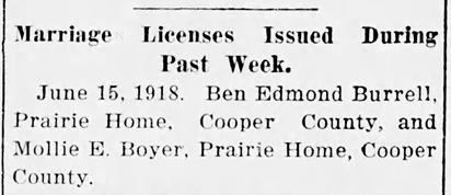 - [S243] U.S. Federal Census 1920 U.S. Federal Census, by Ancestry.com, Year: 1920; Census Place: Prairie Home, Cooper, Missouri; Roll: T625_914; Page: 8B; Enumeration District: 87.