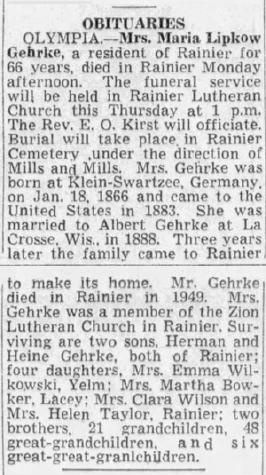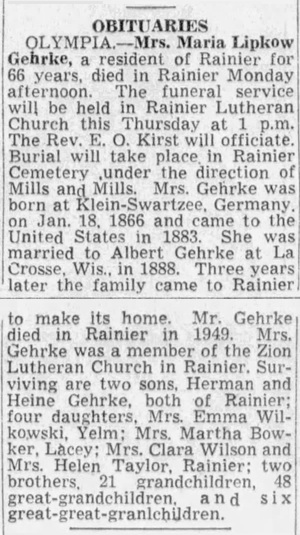 - Emma Marie Gehrke b. 9 Oct 1887, d. 28 Mar 1969