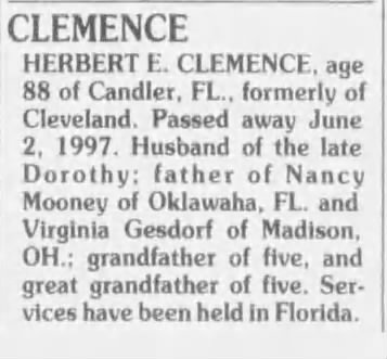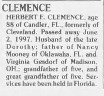 | Father* | Herbert Elmer Clemence b. 10 Sep 1908, d. 2 Jun 1997 |