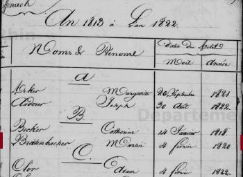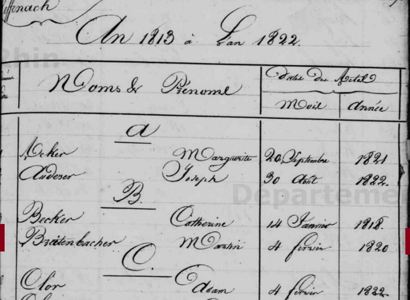 - [S431] French Parish Records Digital Archives, by Government of France, Keffenach - Civil status - Ten-year tables 1813-1822 - 4 E 700. Image 5 of 6.