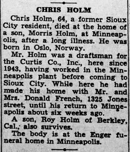 | Father* | Christian J. Holm b. 18 Apr 1883, d. 9 Oct 1947 |