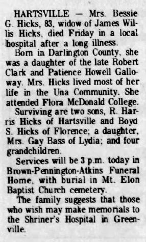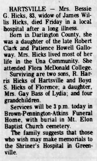 - [S244] U.S. Federal Census 1910 U.S. Federal Census, by Ancestry.com, Year: 1910; Census Place: Swift Creek, Darlington, South Carolina; Roll: T624_1454; Page: 3b; Enumeration District: 0015; FHL microfilm: 1375467.