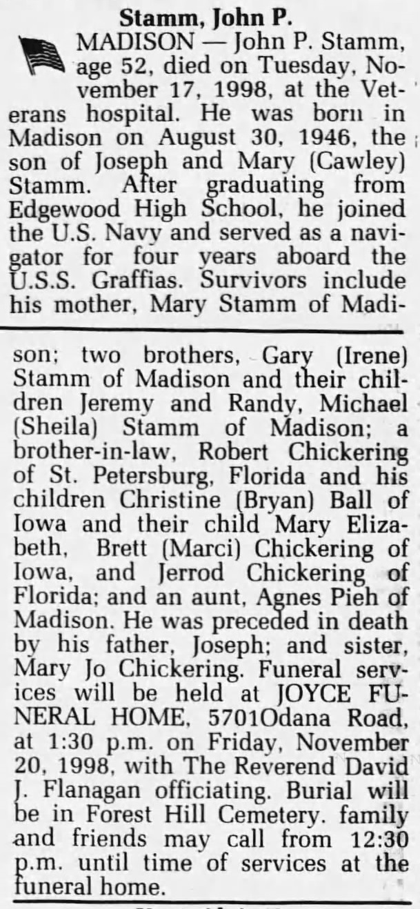 | Father* | Joseph Francis Stamm b. 9 Mar 1911, d. 10 Mar 1988 |