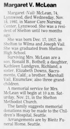 Death | 18 November 1992 | Margaret Vail died on 18 November 1992 at Lynnwood, Snohomish, Washington, at age 74 Margaret (Vail) McLean obituary. |