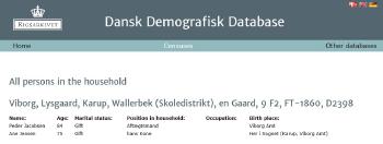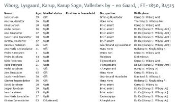 - [S384] The Danish National Archives; Census Records, 1850 Denmark Census - Viborg, Lysgaard, Karup, Karup Sogn, Vallerbek - Jens Pedersen.
