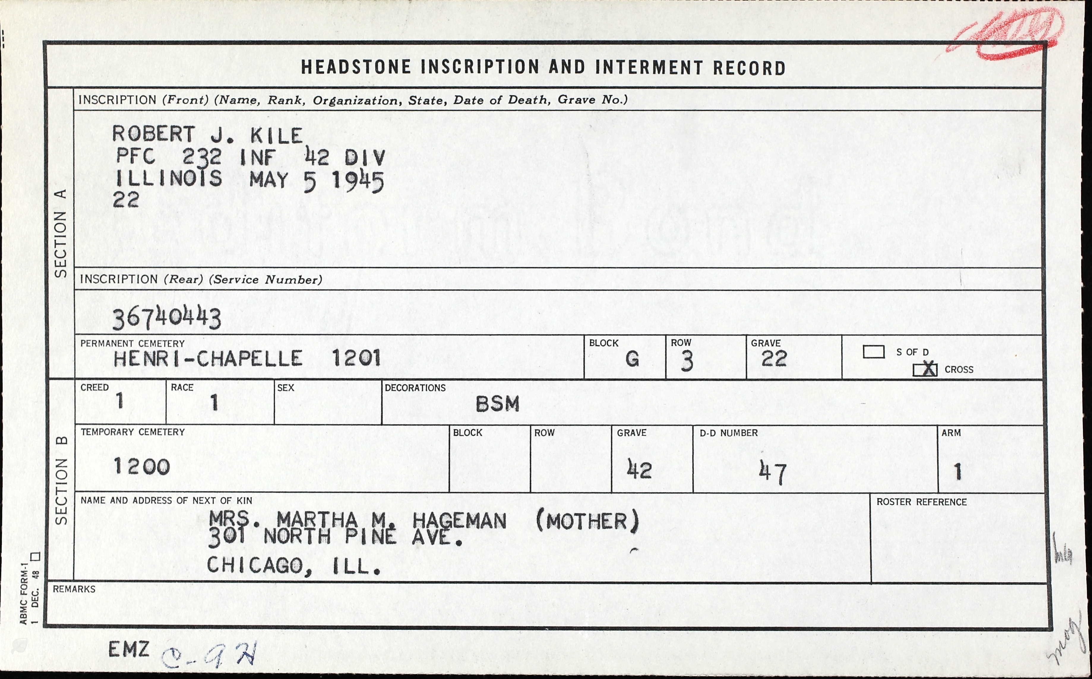- Robert John Kile b. 14 Jul 1924, d. 5 May 1945