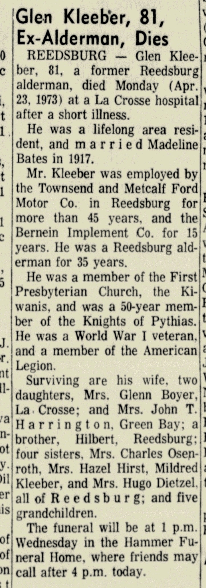 - Glen Kleeber+ b. 18 May 1891, d. 23 Apr 1973