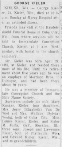 - Irvin L. Kieler+ b. 3 Feb 1908, d. 29 Oct 2000