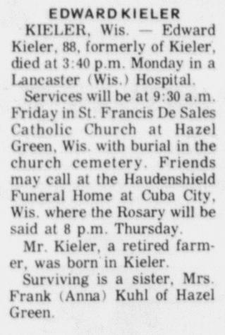 - Francis E. Kieler+ b. 12 Dec 1920, d. 27 Dec 2017