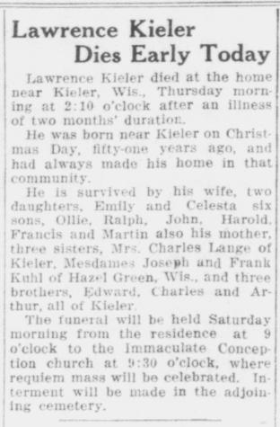- Lawrence George Kieler+ b. 20 Feb 1879, d. Jan 1972
