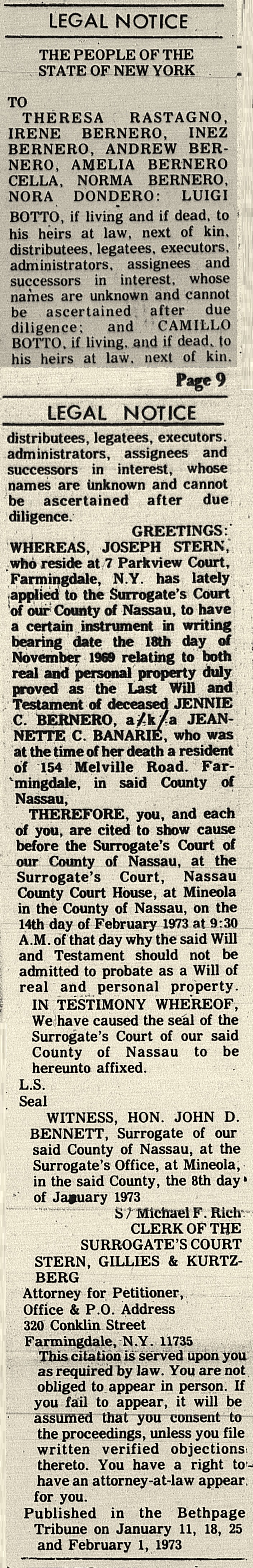 Bethpage (NY) Tribune January 25, 1973 - Jennie C Bernero probate notice