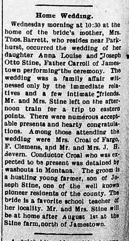 Jamestown Weekly Alert (Jamestown, North Dakota) 18 Jun 1908 - Anna Louise Barrett and Joseph Otto Stine marriage announcement