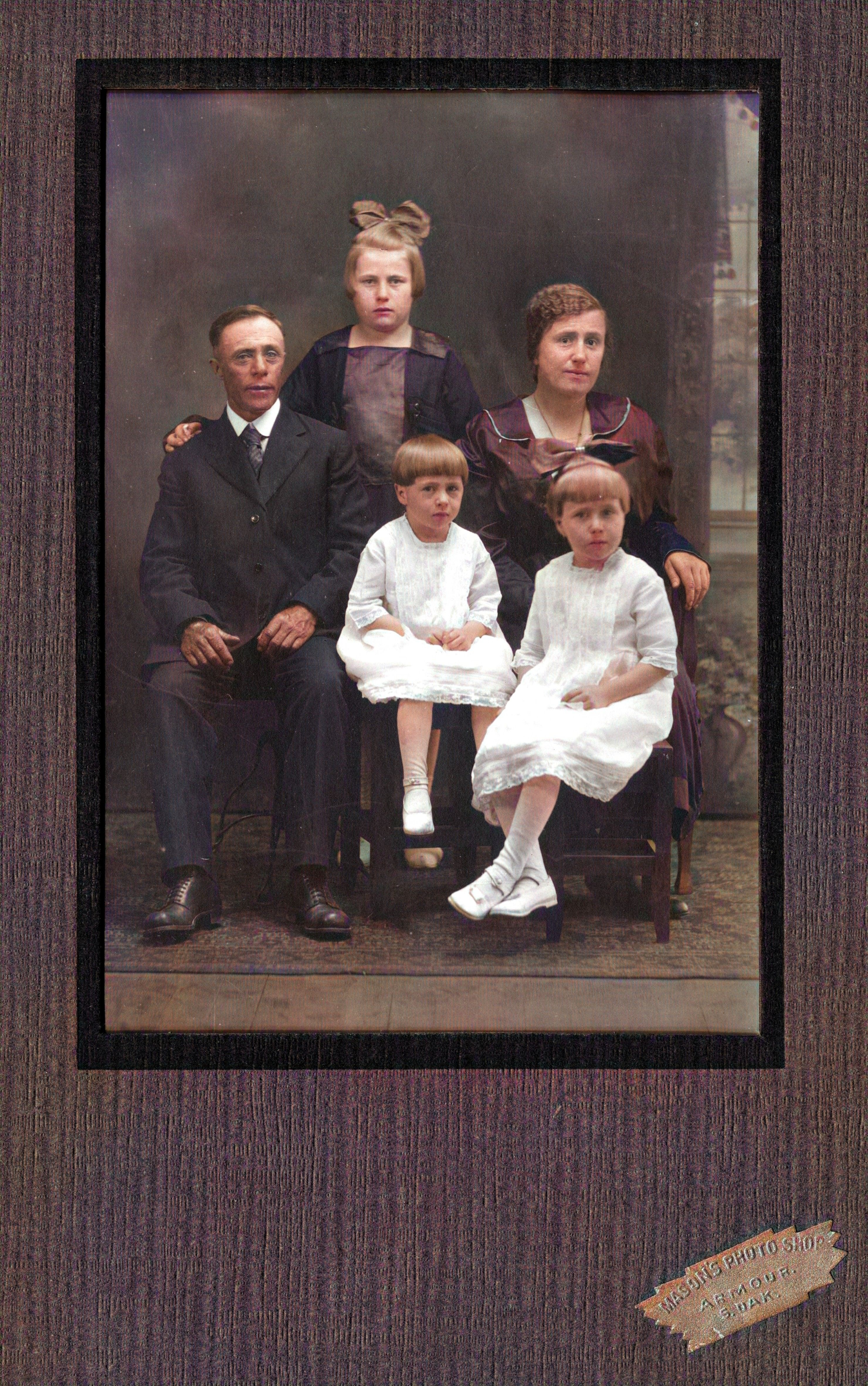 Carl and Hannah Paulson with daughters Esther in back Mabel and Alice-Colorized