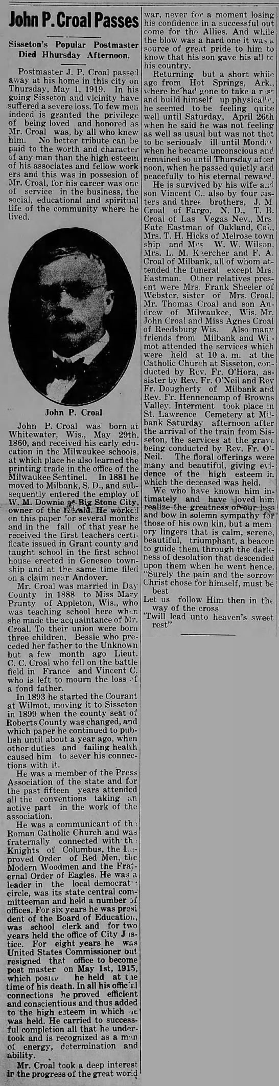 The Sisseton (SD) Weekly Standard - 09 May 1919 - John P Croal obituary