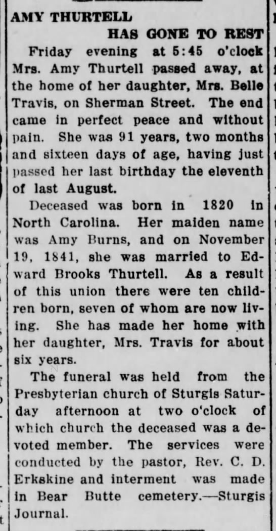 The Daily Deadwood Pioneer-Times (Deadwood, South Dakota) 31 Oct 1911 - Amy (Burns) Thurtell obituary
