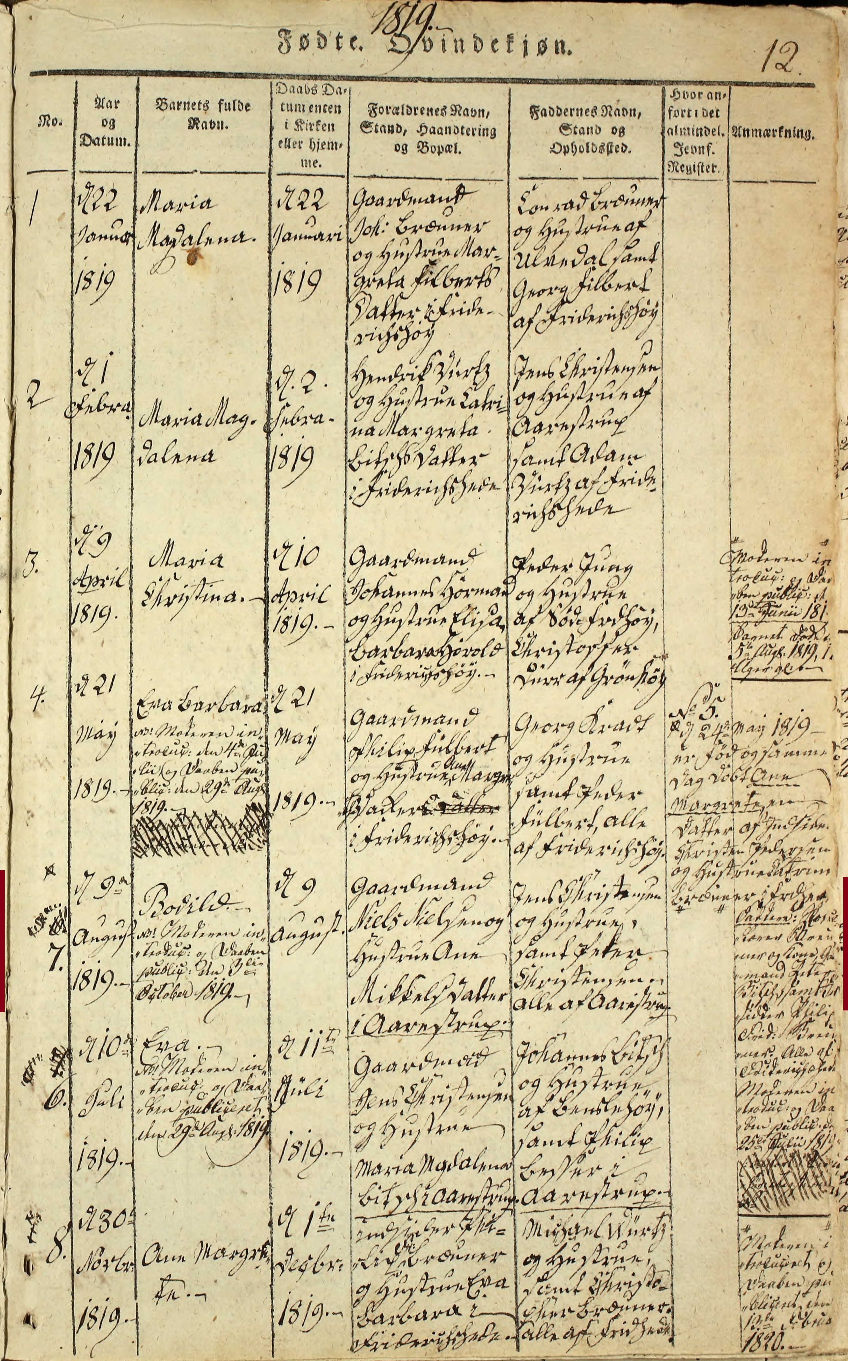 Baptism record of Bodild Nielsdatter 09 Aug 1819 Frederiks Sogn, Viborg Amt, Denmark