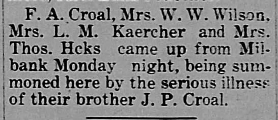 The Sisseton (SD) Weekly Standard - 02 May 1919 - F A Croal, Mrs W W Wilson, Mrs L M Kaercher and Mrs Thomas Hicks summoned by the serious illness of J P Croal