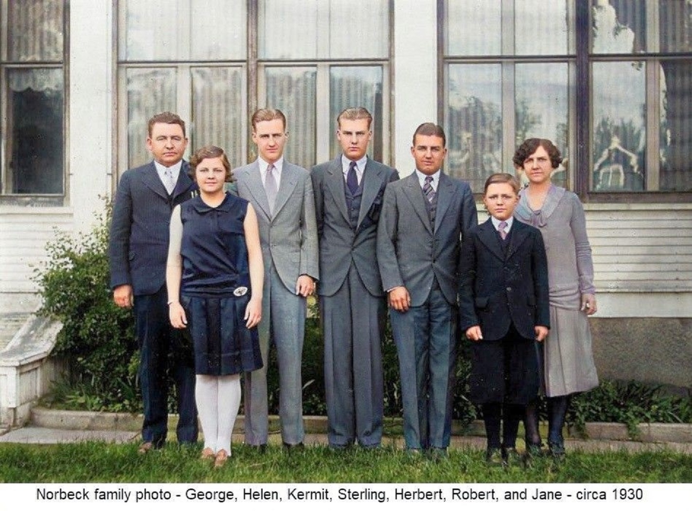 Norbeck family photo - George, Helen, Kermit, Sterling, Herbert, Robert, and Jane - circa 1930-Colorized