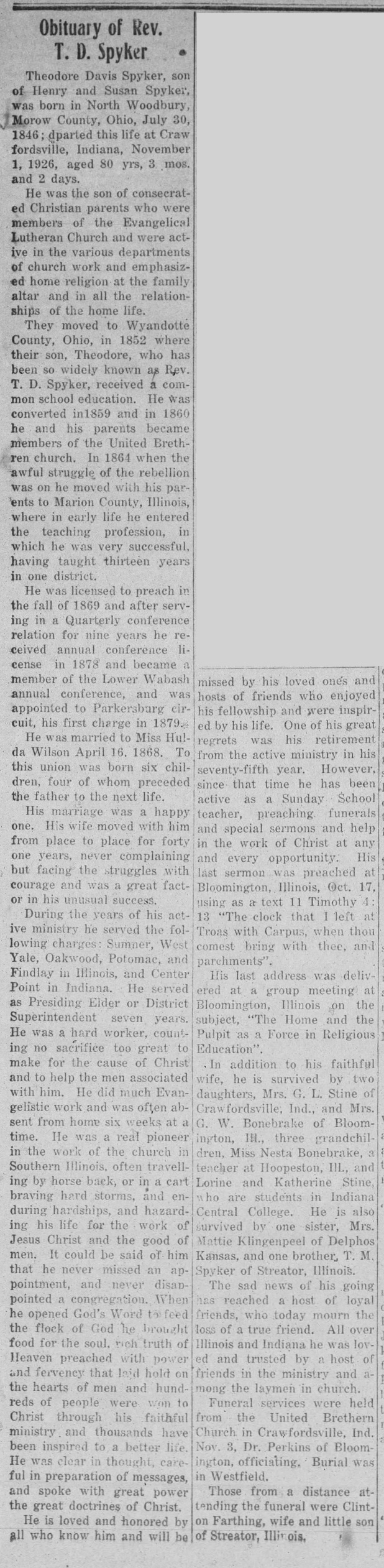 The Kinmundy Express (Kinmundy, Illinois) 11 Nov 1926 - Rev Theodore Davis Spyker obituary