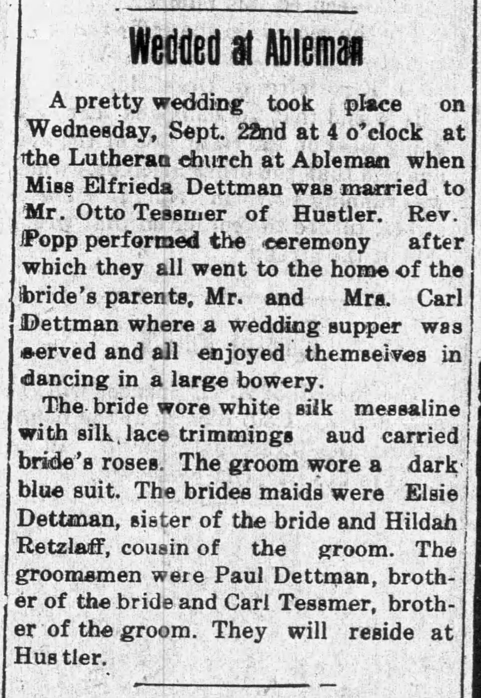 Baraboo News Republic (Baraboo, Wisconsin) 01 Oct 1915 - Otto Tessmer and Elfrieda Dettman marriage announcement