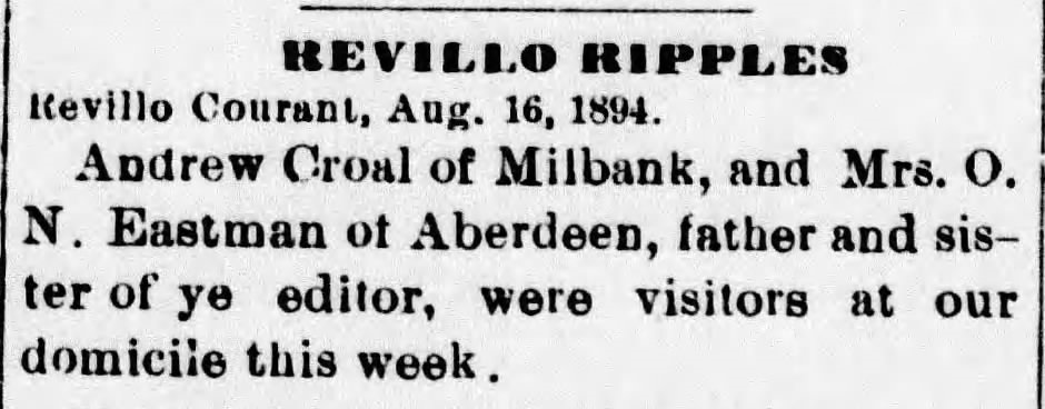 The Herald-Advance (Milbank, South Dakota) 24 Aug 1894 - Andrew Croal and Mrs O N Eastman, father and sister of editor John P Croal visiting