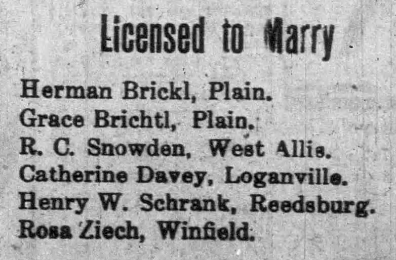 Baraboo News Republic (Baraboo, Wisconsin) 06 Jan 1916 - Marriage license notice of Rosa Ziech and Henry W Schrank