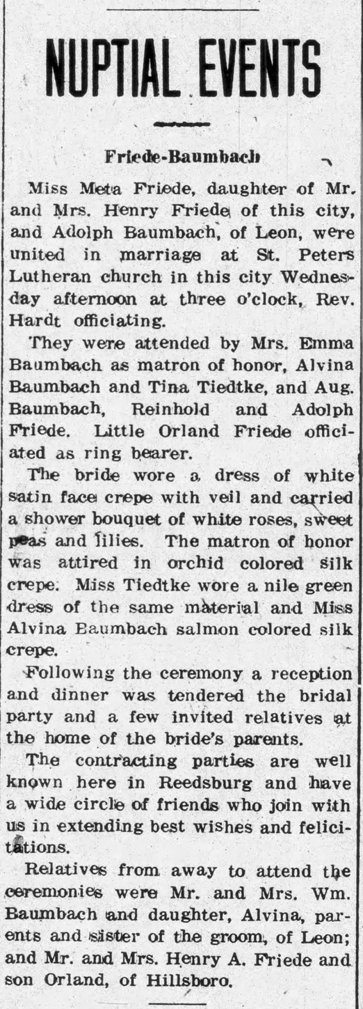 The Reedsburg Times (Reedsburg, Wisconsin) 27 Mar 1925 - Meta Friede and Adolph Baumbach marriage announcement