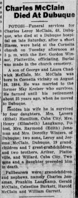 The Platteville Journal and Grant County News (Platteville, Wisconsin) 12 Feb 1953 - Charles McClain obituary